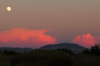 It's a full moon tonight and the clouds were billowing in the east just at the moon was coming up. Perfect timing. The rose of the sunset created a nice backdrop for the moon.